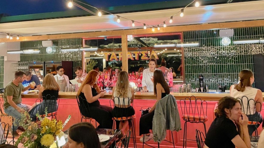 The narrow entrance of the Regal Hotel in Mitropoleos needs to give away something of what is happening on the rooftop. The elevator goes up to the 6th floor. From there, a few stairs lead to the 7th floor and the restaurant Taratsa by Giorgos Melissaris and his partners at Ami, Alexandros Tselepis, and Konstantinos Theodorakopoulos of the much-talked-about bar in front of the bar that achieved 98th place in last year`s The World´s 50 Best Bars. Chef Alexandros Karakatsanis run the kitchen.