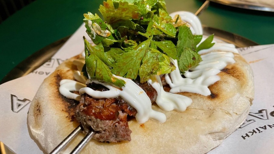 Of the cold dishes, I tried the tender handmade Souza (a Mykonos variant), the also handmade cheese with low intensity and subtle flavours of brioche, as it had cardamom and blackcurrant with a bit of vanilla honey of spruce on the top, and the subtly intense Palamida pastrami served with grilled fatoush salad. The dish that drove my palate crazy was the green beans. As simple as it sounds, here it`s the beans. They are passed through the robata, resulting in a subtle smoky aroma and then topped with a chardonnay vinegar and pomegranate molasses vinaigrette and topped with smoked sour cheese and crunchy nuts. Of course, such a cuisine could only be with kebabs, which are made from 4 different cuts of meat from beef and sheep and served on a Turkish slow-ripened bazlama (pita). As the focus is on the meze, there are also those dishes that invite the guest to make their own compositions. Typical of this category is the Shawarma (for two), which is based on a perfectly tender beef stew and a large straw of roasted celeriac, which invites the guest to place them in a handmade Arabic pie and add the sides, which are yoghurt with tahini, tabbouleh, pickled cucumber and spicy red sauce. There was a slight miss on the celery root, which took a bit of a bite, but the final taste was okay. Aligned with the concept and the original and intense flavours were the desserts, including the Lebanese café au lait with kaimaki ice cream, the wood-fired brioche, and chocolate truffles with spicy ice cream served with Arabic coffee.