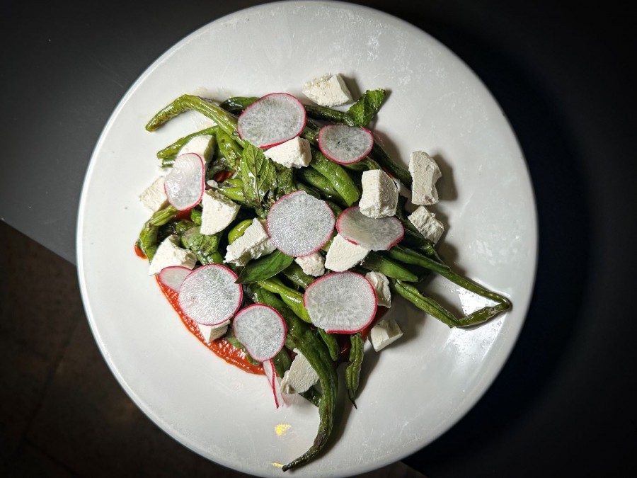 The beetroot dish, featuring beetroot pickles, radishes, and a light garlic almond topping, was delicious. The same can be said for the grilled green beans—chaoulia—paired with a tomato pesto and Florina peppers that created a lovely contrast with the aged goat cheese. Additionally, the classic spaghetti with eggplant is a must-try if available, as it`s not always on the menu. The tagliatelle, stuffed with octopus and accompanied by a delicate fava bean sauce, was enjoyable, though the filling was a bit watery, and the octopus was off-colour. On the other hand, the imam dish was excellent. I tried all three desserts, and they stood out for their well-made almond paste which evokes a charm from times long past.